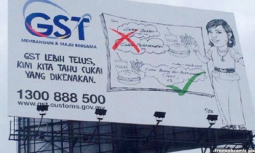 பொருள், சேவை வரியை(ஜிஎஸ்டி) விளக்குவதற்காக நிறுத்திவைக்கப்பட்டுள்ள கேலிச் சித்திரங்கள் கொண்ட விளம்பரப் பலகைகள் அந்த வரியைப் பற்றிச் சரியான முறையில் விளக்கமளிக்கவில்லை என்று ஜாரிங்கான் மலாயு மலேசியா(ஜேஎம்எம்) கூறியுள்ளது. அத்துடன், அவற்றுக்கு நிறைய செலவும் ஆவதாகக் கூறியது.