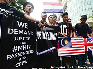 எம்எச் 17 துயரச் சம்பத்தில் பலியானவர்களுக்கு நீதி வேண்டும் என்ற கோரிக்கையை முன்வைத்து பிஎன் ஏற்பாடு செய்திருந்த ஆர்ப்பாட்டத்தில் கிட்டதட்ட 500 பேர் கலந்துகொண்டனர். அவர்கள் ரஷ்ய, உக்ரேனிய தூதரகங்கள் உள்ள சாலைகளிலும் ஐநா அலுவலகத்திலும் திரண்டு ஆர்ப்பாட்டம் செய்தனர்.