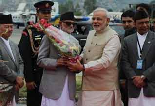 நேபாளம் சென்றுள்ள பிரதமர் நரேந்திரமோடியை, காத்மாண்டு விமான நிலையத்தில், அந்நாட்டு பிரதமர் சுசில் கொய்ராலா, மற்றும் அமைச்சர்கள் மலர்ச்செண்டு கொடுத்து வரவேற்றனர். பின்னர் நோபாள ராணுவம் அளித்த அணிவகுப்பு மரியாதையை மோடி ஏற்றுக் கொண்டார். அப்போது, மிகப் பெரிய தலைவர்களுக்கு வழங்கப்படும் மரியாதைக்கான 19 குண்டுகள் முழங்கப்பட்டன. நேபாள நாட்டின் வழக்கமான புரோட்டோகால் விதிகளை மீறி, பிரதமர் கொய்ராலா நேரடியாக விமான நிலையத்திற்கே வந்து, பிரதமர் மோடியை வரவேற்றது சிறப்பம்சமாக இருந்தது.