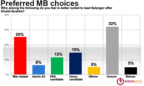 சிலாங்கூரின் அடுத்த மந்திரி புசாராவதற்கான தகுதியான வேட்பாளர் பிகேஆர் தலைவர் டாக்டர் வான் அசிசா வான் இஸ்மாயில்தான் என்பது பெரும்பாலோர் விருப்பமாக இருப்பது மெர்டேகா மையம் மேற்கொண்ட கருத்துக் கணிப்பு ஒன்றில் தெரிய வந்துள்ளது.