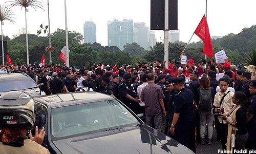 இன்று காலை சுமார் 100 பேர் சிவப்பு உடை தரித்து நாடாளுமன்ற இல்லத்துக்கு வெளியில், எரிபொருள் விலை உயர்வுக்கும் பொருள், சேவை வரிக்கும் எதிர்ப்புத் தெரிவித்தனர்.