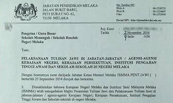 அத்துறையின் இஸ்லாமியக் கல்விப் பிரிவுத் தலைவர் அஹமட் ஹமிஸி அபு ஹசான், மலாக்கா தலைமையாசிரியர்களுக்கு அனுப்பி வைத்துள்ள அறிவிக்கை ஒன்று எல்லாத் தொடக்க, இடைநிலைப் பள்ளிகளிலும் “ஜாவி பயன்படுத்தப்படுவதை வழக்கத்துக்குக் கொண்டுவர வேண்டும்” எனக் கேட்டுக் கொள்கிறது.