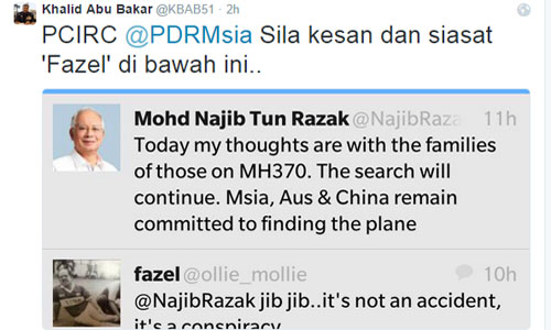 டிவிட்டரில் மலேசிய விமான நிறுவனமான எம்எச்370 பற்றிப் பதிவிட்டிருக்கும் ஒரு பதிவாளர்மீது ஆத்திரமடைந்துள்ளார் போலீஸ் படைத் தலைவர் காலிட் அபு பக்கார்.