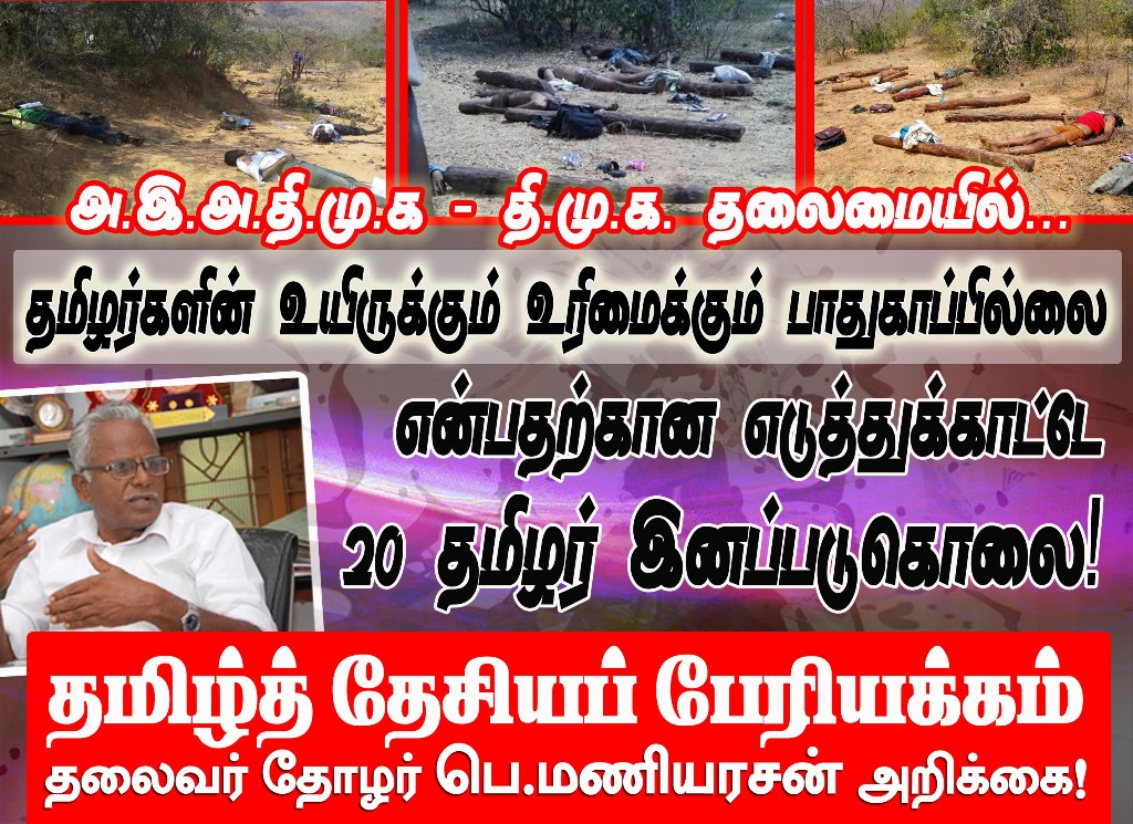அ.இ.அ.தி.மு.க – தி.மு.க தலைமையில் தமிழர்களின் உயிருக்கும் உரிமைக்கும் பாதுகாப்பில்லை என்பதற்கான எடுத்துக்காட்டே 20 தமிழர் இனப்படுகொலை என தமிழ்த் தேசப் பேரியக்கத் தலைவர் தோழர் பெ. மணியரசன் தெரிவித்துள்ளார். இதுகுறித்து அவர் விடுத்துள்ள அறிக்கை வருமாறு:-