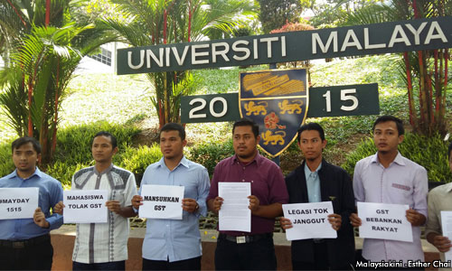 13 மாணவர் அமைப்புகளைச் சேர்ந்தவர்கள் இன்று யுனிவர்சிடி மலாயாவின் வேந்தர் துங்கு மணடபத்துக்குமுன் திரண்டு மே முதல் நாள் நடத்தத் திட்டமிடப்பட்டிருக்கும் #BatalGST பேரணிக்கு ஆதரவு தெரிவித்துக் கொண்டனர்.