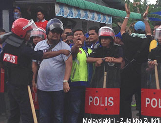 இதனிடையே, எஸ்கே தானா லியாட்டில் உரத்த குரலில் சச்சரவிட்டுக் கொண்டிருந்த பிஎன் மற்றும் பிகேஆர் ஆதரவாளர்களைக் கட்டுப்படுத்த எட்டு சரக்குந்துகளில் போலீசார் வந்திறங்கினர்.