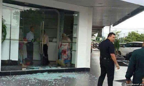 உடைந்த கண்ணாடிக் கதவின் நிழற்படம் டிவிட்டரில் பதிவிடப்பட்டிருந்தது. அதனடியில் ஹாபிஸ் அஷ்ரப் என்பார், “மக்களின் அடக்க முடியாத ஆத்திரத்தின் விளைவு. பெர்லிஸ், கங்கார் தாபோங் ஹாஜி-யைக் குறிவைத்து கல்லெறியப்பட்டிருக்கிறது”, என்று கருத்தைப் பதிவிட்டிருந்தார்.