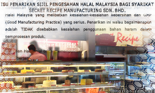 பிரபல கேக் தயாரிப்பு நிறுவனமான சீக்ரெட் ரெசிபிக்குக் கொடுக்கப்பட்டிருந்த ஹலால் சான்றிதழை மலேசிய இஸ்லாமிய மேம்பாட்டுத் துறை (ஜாக்கிம்) இரத்துச் செய்துள்ளது.
