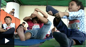 அந்த குடிசைப்பகுதி வாழ்க்கையை கொஞ்சம் சகிக்கக்கூடியதாக மாற்ற அங்கு வந்துள்ளது யோகா. -BBC