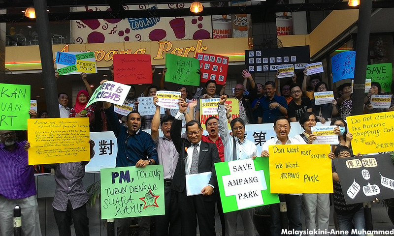 அம்பாங் பார்க் கடைக்காரர்கள் 100-க்கு மேற்பட்டவர்கள் அந்த வர்த்தக மையத்தை உடைப்பதற்கு எதிர்ப்புத் தெரிவித்து ஆர்ப்பாட்டத்தில் ஈடுபட்டனர்.