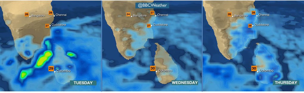அதே நேரத்தில் பி.பி.சி. மீண்டும் ஒரு எச்சரிக்கையை இன்று விடுத்துள்ளது. சென்னையில் நாளை மறுநாள் புதன்கிழமை முதல் இடியுடன் கூடிய கனமழை பெய்யும் என வானிலை வரைபடங்களுடன் அது எச்சரித்துள்ளது.