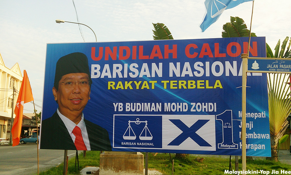 விளம்பரப் பலகைகளில் “Undilah calon BN, rakyat terbela. Menepati janji, membawa harapan” என்ற வாசகம் காணப்படுகிறது. புடிமானின் படமும் பிஎன் சின்னமும் பொறிக்கப்பட்டுள்ளன.