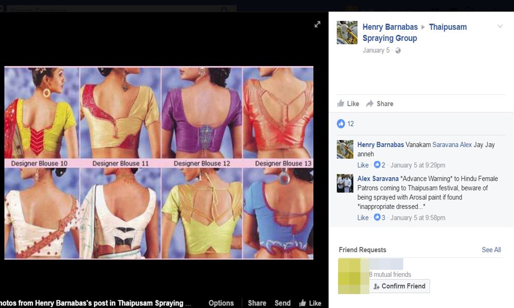 தைப்பூசத்துக்குப் பெண்கள் ஆடை அணிந்து வரும் முறை என்றும் ஒரு பிரச்னையாக இருந்ததில்லை என்றாரவர்.
