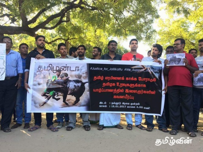 இனத்தின் வீர விளையாட்டு! எனும் தலைப்பின் கீழ் “ஏறு தழுவுதல்” மீட்புப் போராட்டத்தில் உயிர் உருகும் தாய்த் தமிழக உறவுகளுக்கு ஆதரவு தெரிவிக்கும் ஈழத்தமிழ் உறவுகள் நாங்கள்!, தடை அதை உடை! போன்ற பிரதானவாசகத்தைத் தாங்கியும்,