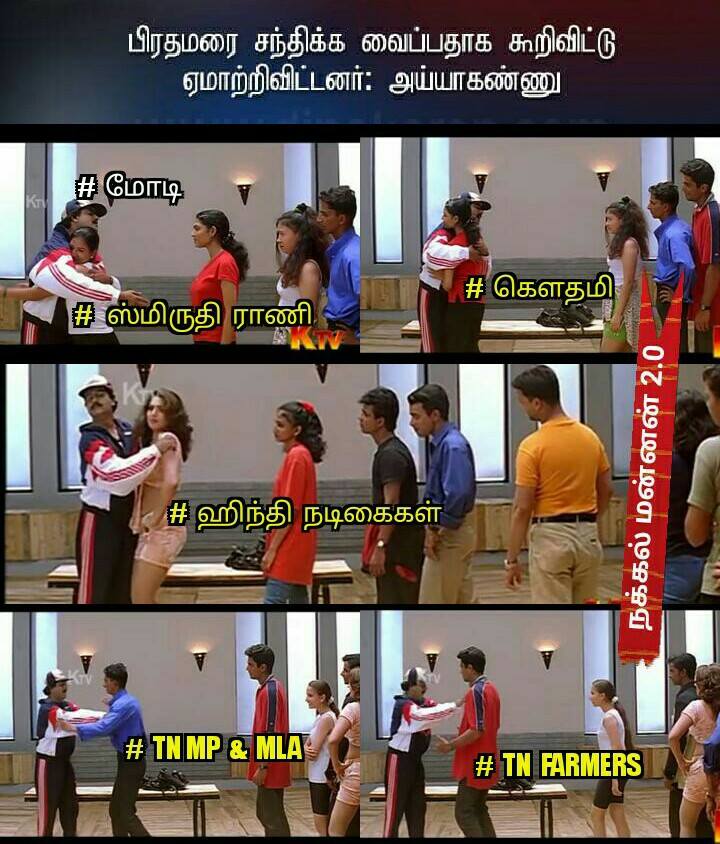 நடிகைகளை மோடி சந்திப்பதை வைத்து ஒரு வலைஞர் மீம்ஸ் பதிவிட்டுள்ளார். இதை பார்க்கும் போது விவசாயிகள் எழுப்பிய கேள்வி தவறில்லை என்றே பலரும் பதிவிட்டு வருகின்றனர்.