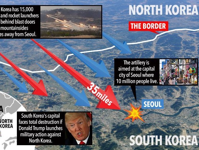 அவர்கள் நிலைகள் மீது வட கொரியாவால் தாக்குதல் நடத்த முடியும். அதுபோக ஹவ்வாய் தீவுகள், பையோகன்ஸ் தீவுகளில் உள்ள நிலைகள் மீது கூட வட கொரியாவால் தற்போது தாக்குதல் நடத்த முடியும். இதுபோக அவர்கள் வைத்திருக்கும் பலஸ்டிக் ஏவுகனை அமெரிக்கா வரை சென்று தாக்க வல்லவை. ஆனால் அமெரிக்கா வட கொரியாவை தாக்க முடியாத நிலை தற்போது தோன்றியுள்ளது. காரணம் என்னவென்றால், வட கொரியா , ஒரு மலைப் பிரதேசத்தை தேர்ந்து எடுத்து, அதில் மிகவும் பாதுகாப்பான முறையில் 15,000 ஏவுகணைகளை பொருத்தி உள்ளது. இது வட கொரியா மற்றும் தென் கொரிய எல்லையில் உள்ளது. அமெரிக்காவின் உற்ற நட்ப்பு நாடான தென் கொரியாவின் தலை நகர் சியோலில் இருந்து வட கொரிய ஏவுகணை தளம் வெறும் 35 மைல் தொலைவில் தான் உள்ளது.