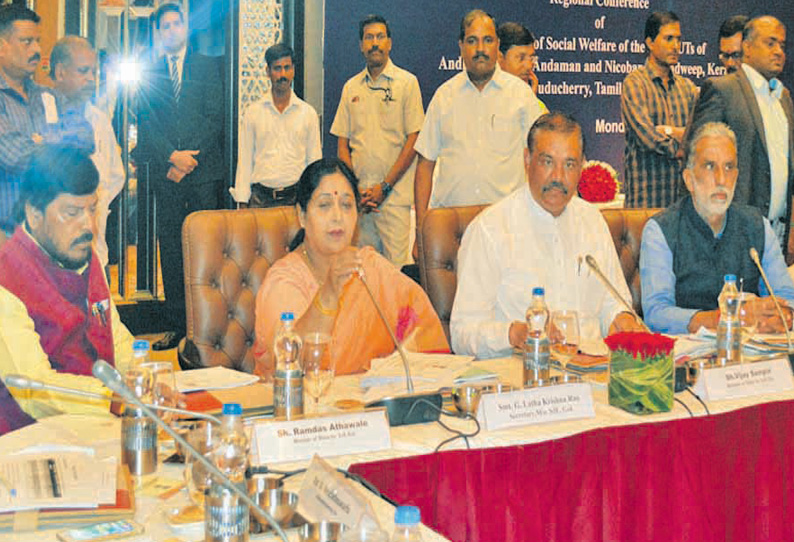 கூட்டத்தில், மத்திய மந்திரிகள் ராம்தாஸ் அத்வாலே, விஜய் சம்ப்லா, தமிழ்நாடு சமூக நலத்துறை அமைச்சர் வி.சரோஜா, பிற்படுத்தப்பட்டோர் நலத்துறை அமைச்சர் எஸ்.வளர்மதி, ஆதி திராவிடர் நலத்துறை அமைச்சர் வி.எம்.ராஜலட்சுமி, புதுச்சேரி சமூகநலம் மற்றும் ஆதிதிராவிடர் நலத்துறை அமைச்சர் எம்.கந்தசாமி, மத்திய சமூக நீதி மற்றும் அதிகாரம் அளித்தல் துறை செயலாளர் ஜி.லதா கிருஷ்ணா ராவ் உள்ளிட்டோர் கலந்து கொண்டனர்.