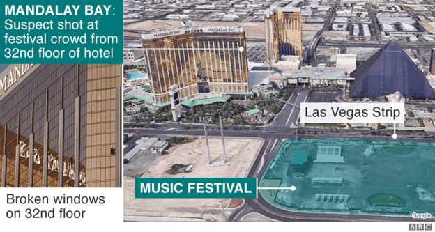 ஸ்டீஃபன் பேடக்,மாண்டலே பே ஹோட்டலின் உள்ள 32வது மாடியில் உள்ள அறையில் தங்கியிருந்தார். அறையில் இருந்த இரண்டு ஜன்னல்கள் வழியாக மாறி மாறி மக்களை நோக்கி சுட்டார் என கருதப்படுகிறது.
