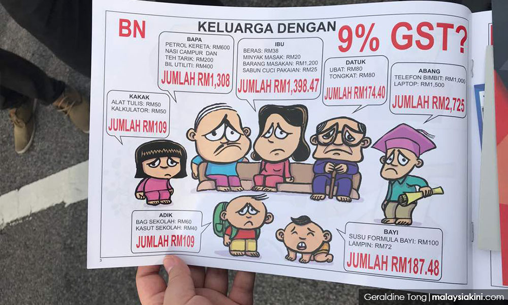 நேற்று, மலாக்காவில் ஹராப்பான் தேர்தல் பிரச்சாரத்தில் விநியோகிக்கப்பட்ட அறிக்கை ஒன்றில், ஜி.எஸ்.டி. 9 விழுக்காடு வரை உயர்த்தப்படும் என்றும் அதனால் அத்தியாவசியப் பொருள்களின் விலை உயரும் என்றும் கூறப்பட்டிருந்தது.