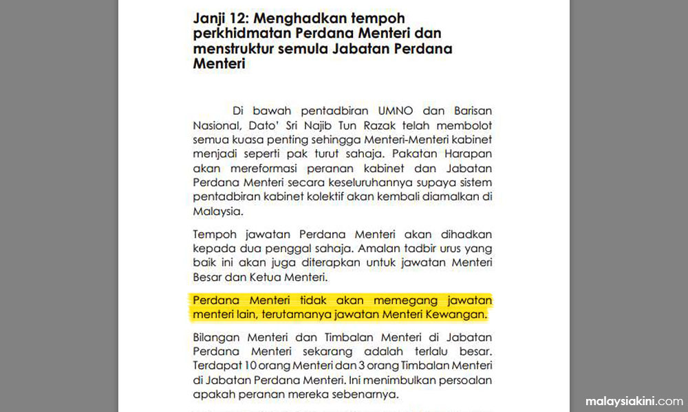 பிரதமர் அமைச்சர் பதவி வகிக்க முடியாது, குறிப்பாக நிதியமைச்சர் பதவி என்று, பக்காத்தான் ஹராப்பான் தேர்தல் அறிக்கையில் 12-வது உறுதிமொழி கூறுகிறது.
