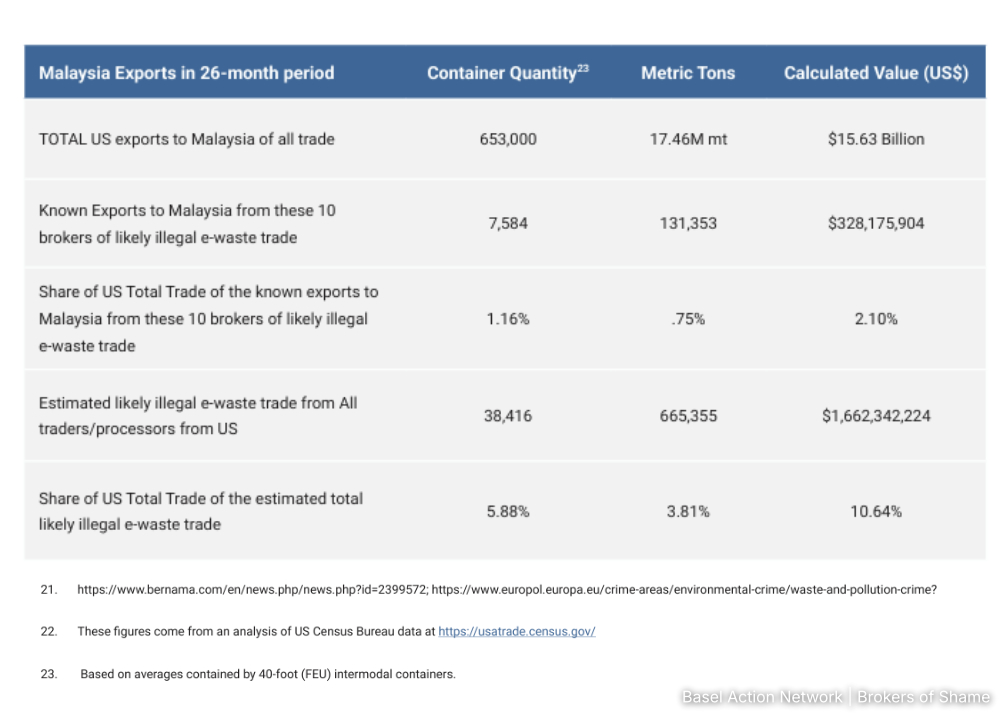 7,600 கொள்கலன்களில் கொண்டு செல்லப்பட்ட மலேசியாவால் பெறப்பட்ட மின்-கழிவுகளின் அளவு, அந்தக் காலகட்டத்தில் தரகர்கள் அமெரிக்காவிலிருந்து ஏற்றுமதி செய்த 169,497 மெட்ரிக் டன்களில் 75 சதவீதத்திற்கும் அதிகமாக இருக்கும் என மதிப்பிடப்பட்டுள்ளது.