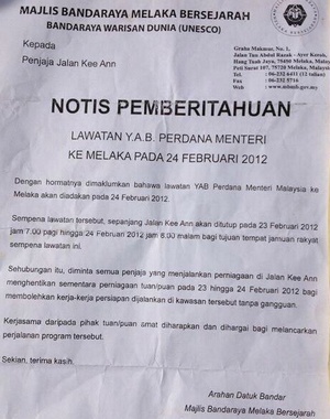மலாக்கா மாநகராட்சி மன்றத்தின் அதிகாரத்துவ தாளில் வெளியிடப்பட்ட அந்த நோட்டீஸ், நஜிப் வெள்ளிக் கிழமை அதிகாரத்துவ வருகையை மேற்கொள்வதாகவும் மக்கள் விழாவை ஒட்டி வியாழக் கிழமை காலை 7 மணி முதல் வெள்ளிக் கிழமை இரவு எட்டு மணி வரை ஜாலான் ஆ கீ மூடப்படும் என்றும் கூறியது.