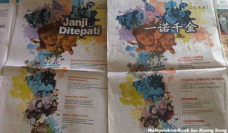 கடந்த ஒர் ஆண்டில் நஜிப் நிர்வாகம் மக்களுக்கு விநியோகம் செய்த மொத்த ரொக்கப்பணத்தை பட்டியலிடும் முழு பக்க வண்ண விளம்பரங்கள் அனைத்து மொழி நாளேடுகளிலும் இடம் பெற்றுள்ளது.