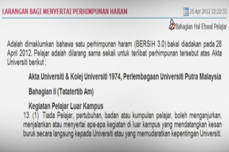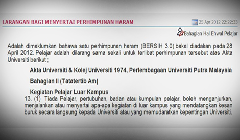 பல்கலைக்கழக, பல்கலைக்கழகக் கல்லூரிச் சட்டத்தில் செய்யப்பட்டுள்ள புதிய திருத்தங்களின் கீழ் கூடுதல் சுதந்திரம் வழங்கப்படும் என வாக்குறுதி அளிக்கப்படுள்ள போதிலும் யூபிஎம் என்ற மலேசியா புத்ரா பல்கலைக்கழகம் சனிக்கிழமை நிகழும் பெர்சே 3.0 பேரணியில் தனது மாணவர்கள் பங்கு கொள்வதற்குத் தடை விதித்துள்ளது.