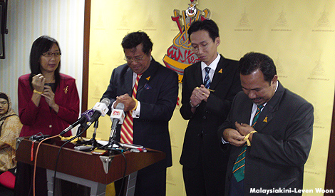 மாநில அரசாங்கம் ஏற்பாடு செய்திருந்த நிருபர்கள் சந்திப்பில் கலந்து கொண்ட மந்திரி புசார் காலித் இப்ராஹிம், முதுநிலை ஆட்சி மன்ற உறுப்பினர் தெரெசா கோக், ஆட்சி மன்ற உறுப்பினர்களான இயான் யோங் ஹியான் வா ஆகியோர் அங்கிருந்த நிருபர்கள் கேட்டுக் கோண்டதற்கு இணங்க மஞ்சள் நிற துண்டுகளை கைகளில் அணிந்திருந்தனர்.