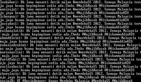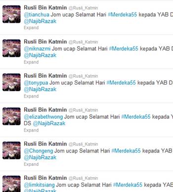 நேற்று புக்கிட் ஜலிலில் நிகழ்ந்த மெர்தேக்கா கொண்டாட்டங்களின் தொடர்பில் பிரதமர் தமது டிவிட்டரில் hashtag #Merdeka55-ஐ பயன்படுத்த தொடங்கிய ஒரு மணி நேரத்தில் ஒரு மில்லியன் டிவிட் செய்திகளை தகவல், தொடர்பு, பண்பாட்டு அமைச்சர் ராயிஸ் யாத்திம் எதிர்பார்த்தார்.